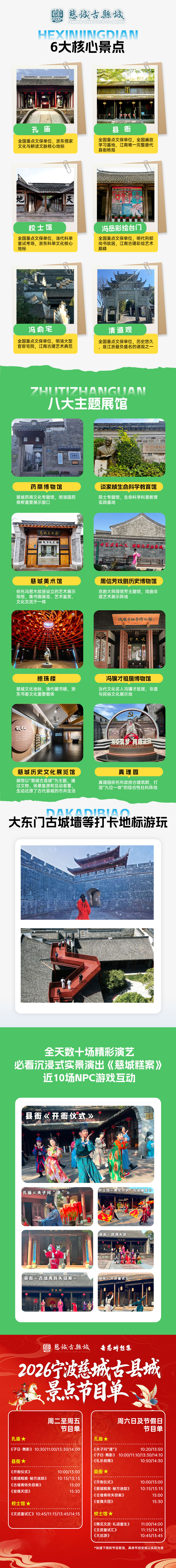 2.谈家桢生命科学教育馆,慈城美术馆,周信芳戏剧历史博物馆,抱珠楼展馆,真理园9:00-16:00;冯骥才祖居博物馆9:30-15:00;慈城历史文化展览馆9:00-18:30